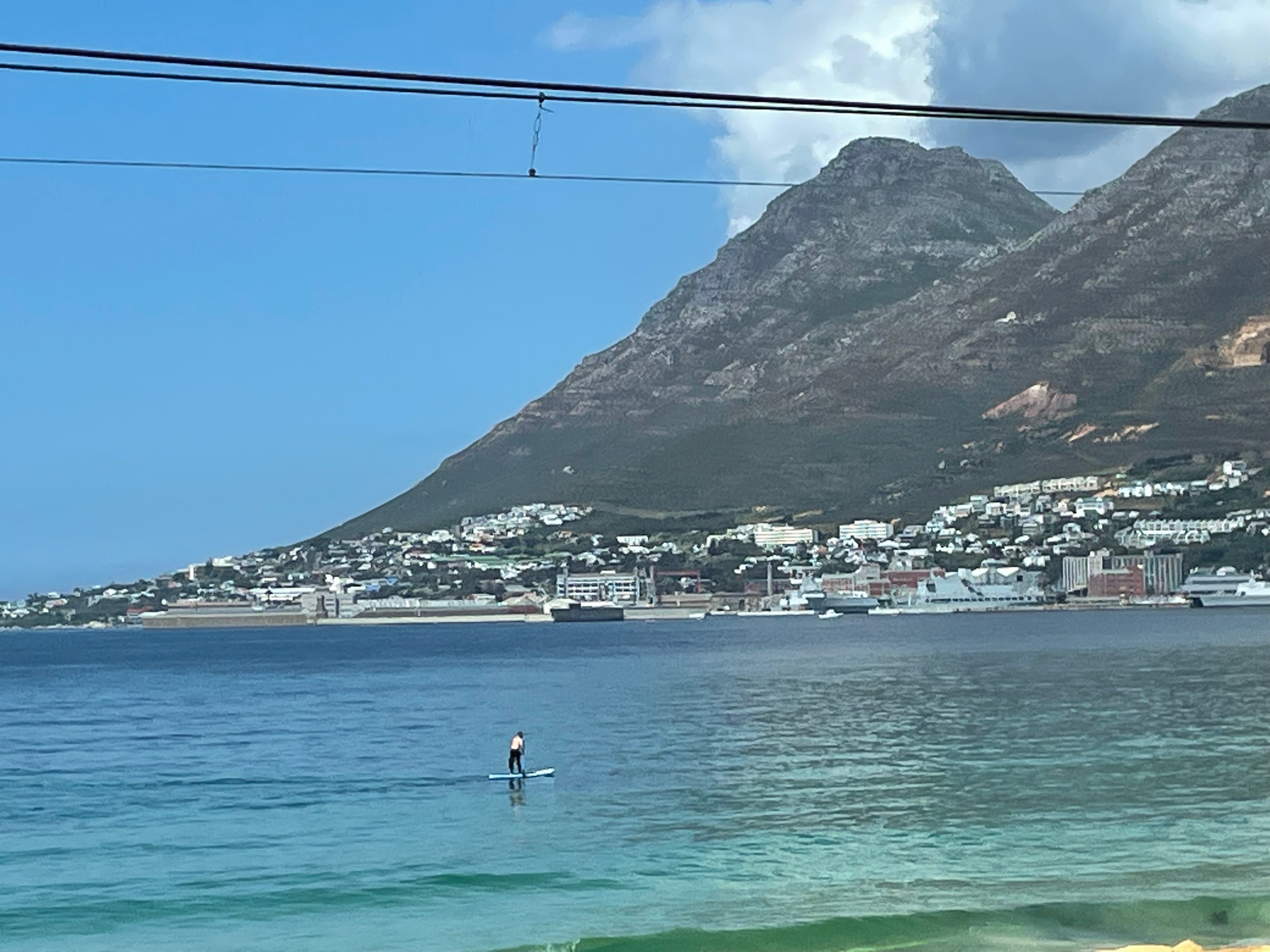 Breakfast was a long time ago and we go looking for something to eat. The restaurant, Two Oceans, (people think this is where the Atlantic and Indian Oceans meet. It's really not; that's where we're going tomorrow (foreshadowing!). There is a "food shop", though, and we each get a salad and drink. I'm having a tuna salad that is dressed with some sort of vinegar, maybe balsamic, and is delicious! And I'm having a vanilla decaf latte! Talk about decadent!